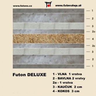 Je to tradiční a pevný futon pro člověka, který hledá pohodlnost se stabilitou. je složena ze 3 pružných vrstev.Kokosová vrstva je tvrdší a pevnější, latexová dodává futonu potřebnou měkost a elasticitua bavlna potřebné a žádané vlastnosti. Výsledný efekt je komfortní spaní pro náročnou klientelu.