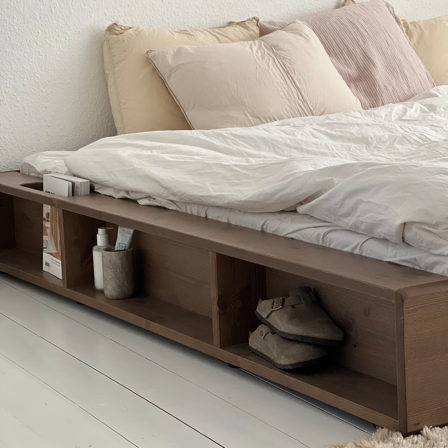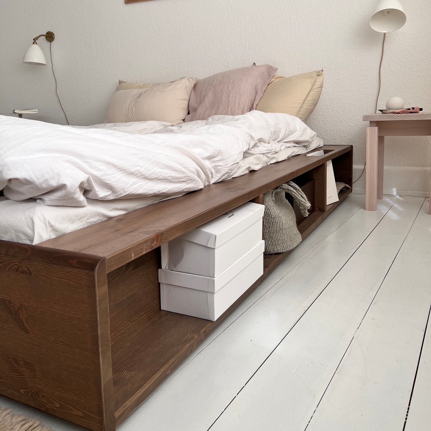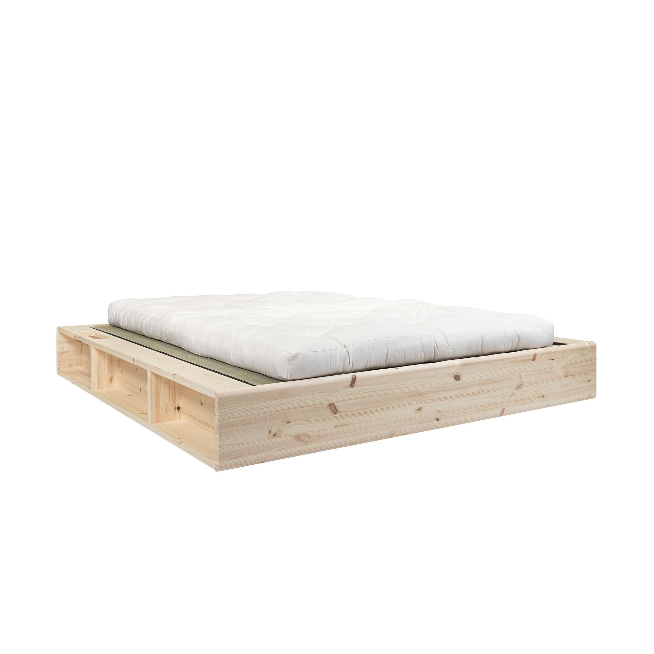 Postel a úložný prostor. Ziggy je navržen s velkým důrazem na materiály a funkčnost. Měkký zakřivený rám postele je vyroben z masivního borovicového dřeva certifikovaného FSC® a je k dispozici v přírodním světle borovicovém dřevě nebo potažený černým lakem na vodní bázi. Funkčnost Ziggy je zabudována přímo do rámu, celkem šest otevřených úložných prostorů, což umožňuje více úložného prostoru v menších bytech nebo domácnostech. Pro uložení vašich oblíbených knih má rám inteligentní boční kapesní systém. Široký povrch rámu navíc umožňuje snadné nabíjení chytrých zařízení přímo u postele a nahrazuje noční stolek. Na rám postele Ziggy lze přidat tatami a vytvořit tak japonský vzhled vaší ložnice.